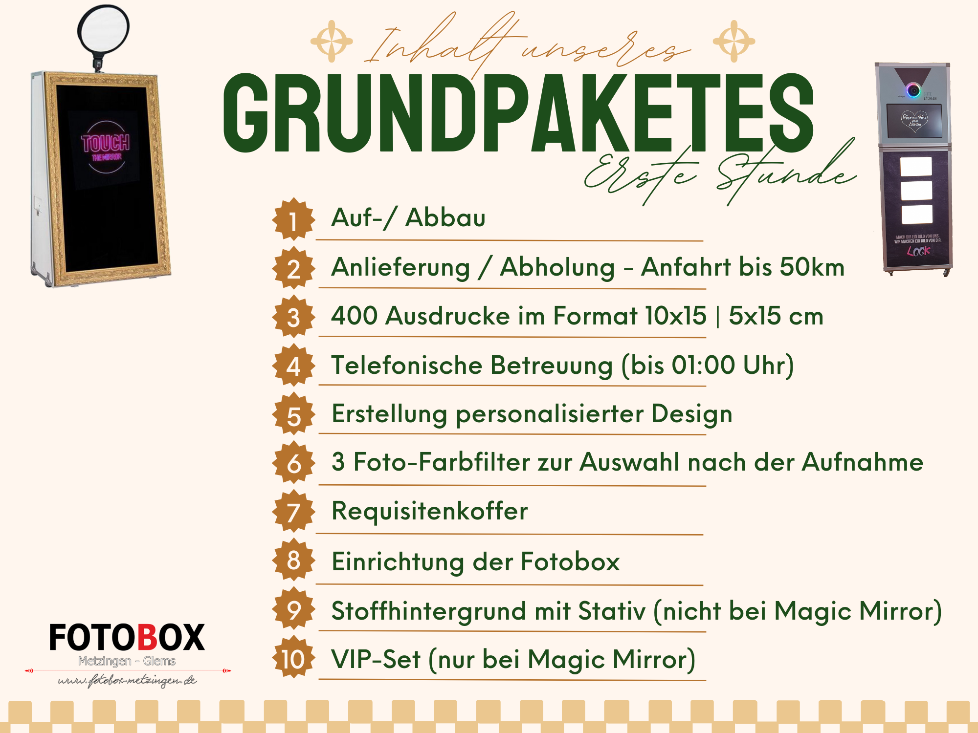 Der jeweilige Preis für eine Fotobox ist abhängig vom ausgewählten Druckformat, der Buchungsdauer und den Zusatzoptionen. Tagespauschale bzw. Eventpauschale sind auf Anfrage möglich. Bei einer Buchung bis 10 Stunden, kann auch stundenweise eine Fotobox gebucht werden. Es werden nur die Stunden gerechnet, in denen die FOTOBOX in Betrieb ist.  Bei allen Geräten wird das Grundpaket für die erste Stunde berechnet, weitere Stunden können je nach Anforderung und Situation hinzugebucht werden.
